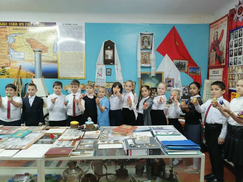Чтобы расширить кругозор детей о православном празднике Привольненская сельская библиотека в музее села провела час духовности «Вот и Пасха, запах воска, запах теплых куличей».